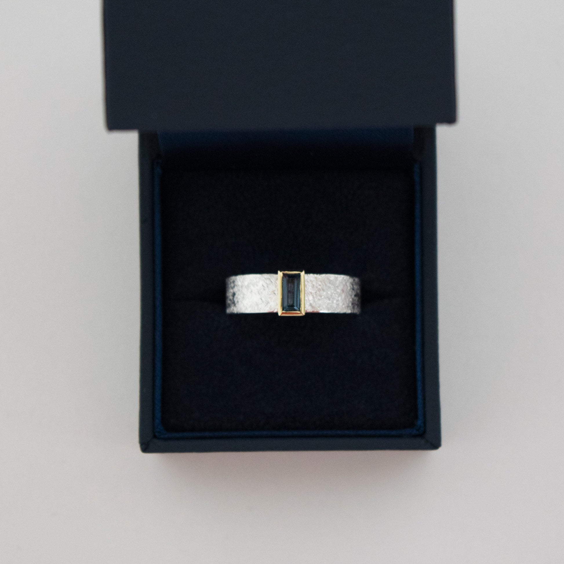 A geometric deep blue topaz set in warm 9ct yellow gold on our signature textured sterling silver band.